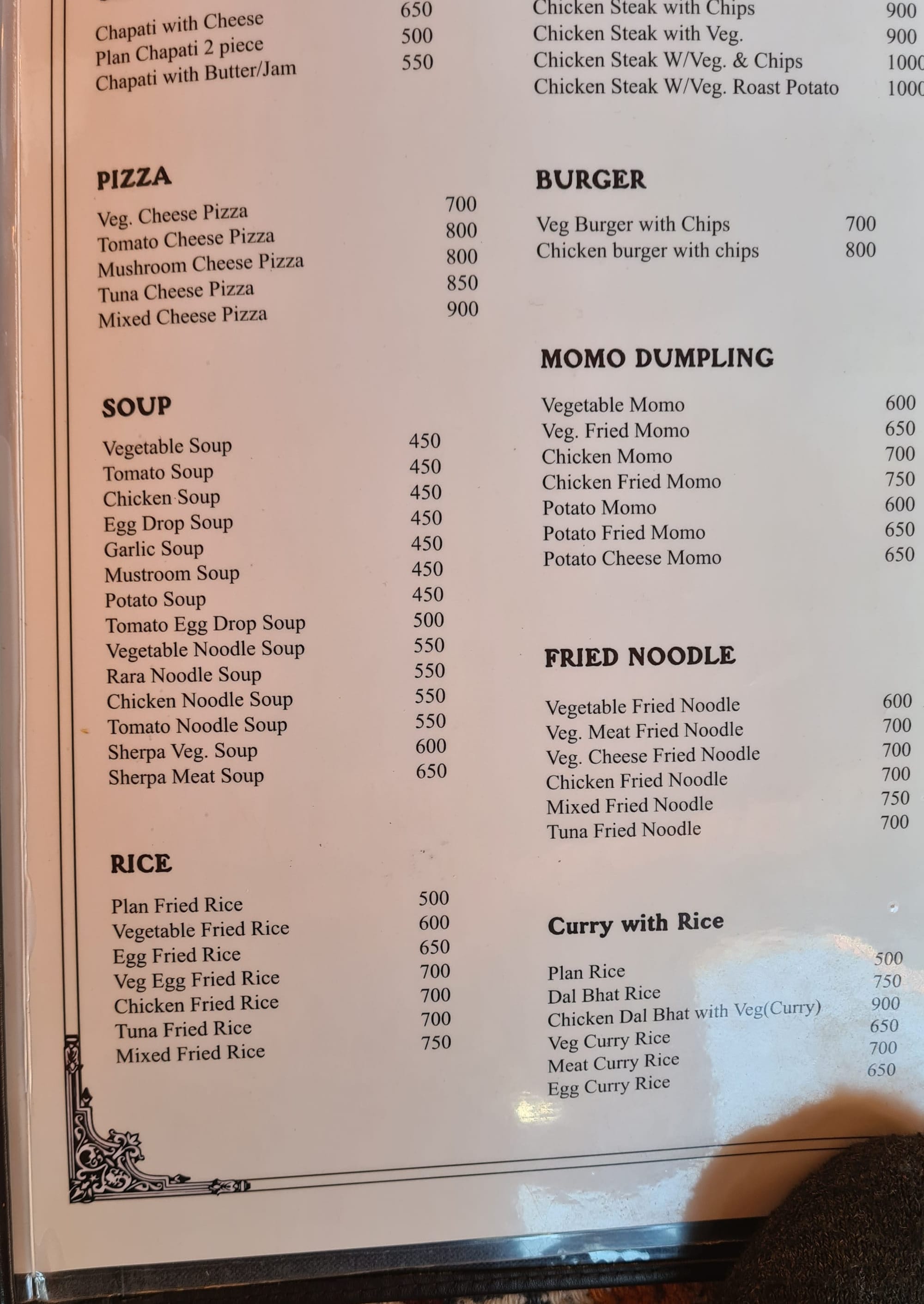 - Ruoka: dal bhat, pizza, riisi, momo, nuudelit, perunat