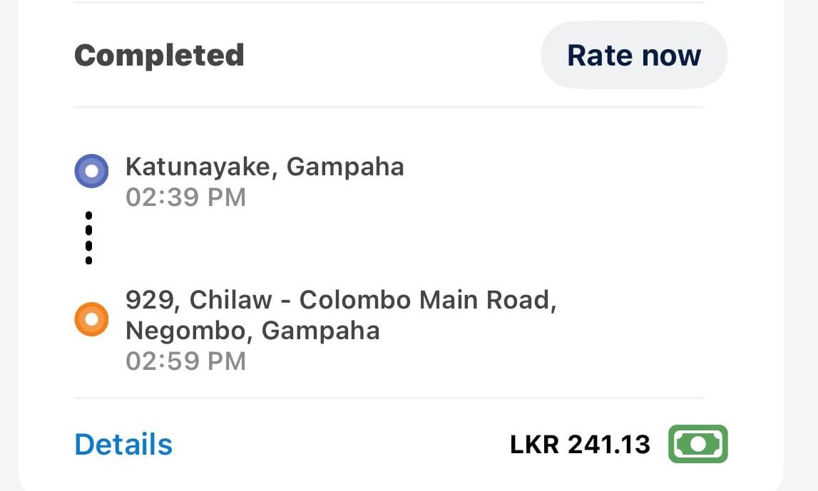 Lentokentältä jatkoimme hotellille tuk-tukilla, jonka varasimme PickMe-taksisovelluksella. Se oli vaivan arvoista, vaikka jouduimmekin kävelemään muutaman askeleen pois lentokentän aidatulta alueelta. Lentokentillä on yleensä taksimafia, joka pitää taksien hinnat korkeina, niin myös Sri Lankassa. Useampi kuski lähestyi meitä, mutta ystävällinen "ei kiitos" riitti kuskeille (aina se ei ole näin). Kyydin saapuessa lyhyt 7 minuutin matka vei meidät hotellille (maksoi 241.13 rupiaa, noin 0,78€).