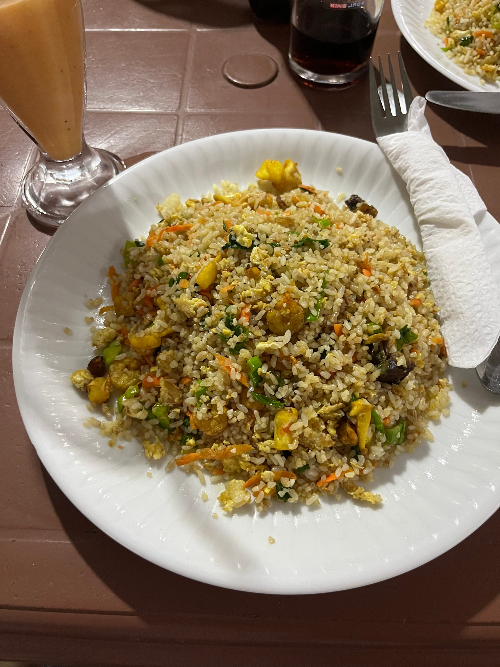 Lopulta ruoka (fried rice with seafood) saapui yllättävän pitkän odotuksen jälkeen. Ruoka ei vakuuttanut, mutta kovan nälän ollessa sain syötyä mikä minusta näytti isolta lautaselta riisiä, hieman merenelävillä maustettuna.